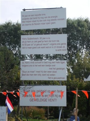 Donderdag 27 september is Harry Spijkerbosch 50 jaar geworden. Voormalig eerste elftalspeler / elftalleider / ………., kreeg dus woensdagavond niet geheel onverwacht bezoek van familie, buren, “vrienden” en vage kennissen om de tuin van Harry op te sieren met 5 abrahams, borden met fraaie teksten en meer van dit soort ongein. Harry, “de gasverkoper” fervent supporter van Ajax & Klarenbeek is ook liefhebber (ondanks zijn slechte knieën) van… Mountainbiken in het bos, hij rijdt er wekelijks diverse routes op los. Zo blijft hij fit en zou je dus ook niet zeggen dat hij reeds de 50 gepasseerd is. Met zijn welbekende uitspraken als, vrogger was alles beter, stuur ze maar, ut geluud zit veurin en zo kunnen we er nog wel een paar noemen is hij toch wel het icoon van Sportclub Klarenbeek.